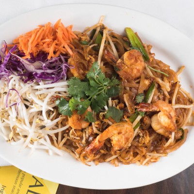 Rice noodles with choice of meat and egg served on lettuce topped with ground peanut