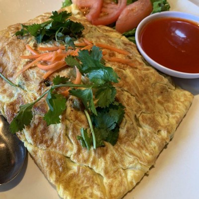 Stir fried ground beef, tomato, onion, bell pepper, curry powder in gravy over rice noodle and topped with fried egg